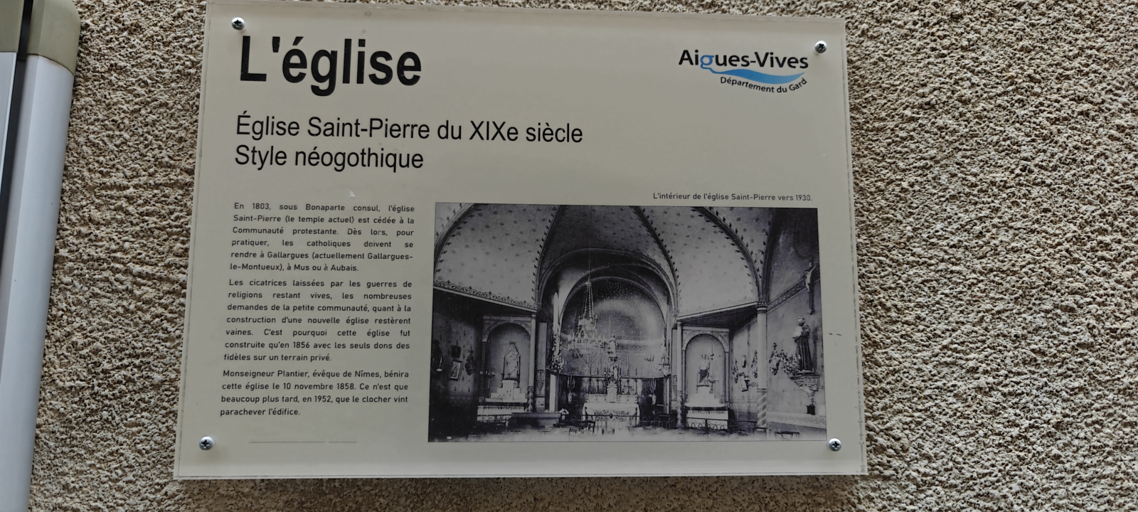 • Les catholiques, privés de lieu de culte, firent appel à la générosité locale et à l’appui de l’évêché de Nîmes pour reconstruire leur église. La nouvelle église Saint-Pierre, de style néogothique, fut érigée en 1855 dans le quartier du Cantonnat.