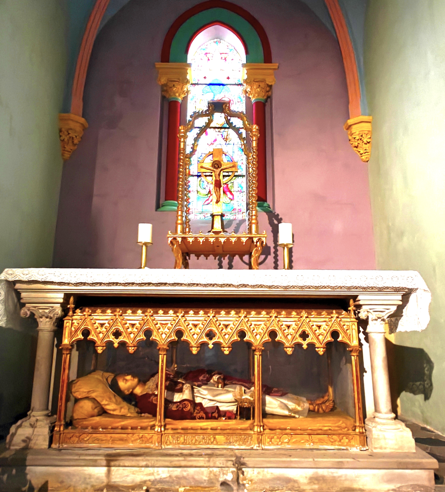 Le tout est dans une châsse achetée en 1868 (journal du trésorier, arch. dioc.). La translation s'est faite en juin 1865, en même temps que la pose de la première pierre.