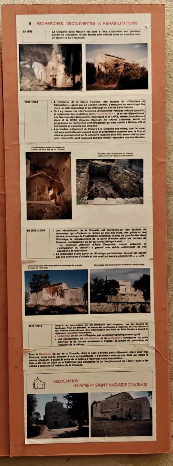 • À la fin du XXᵉ siècle, des opérations de débroussaillage menées par des bénévoles ont permis de révéler ce trésor enfoui sous un tumulus ; depuis, des restaurations (intérieures, logis effondré, voûte du chœur) ont été engagées, soutenues par l’association locale, la mairie et la DRAC.